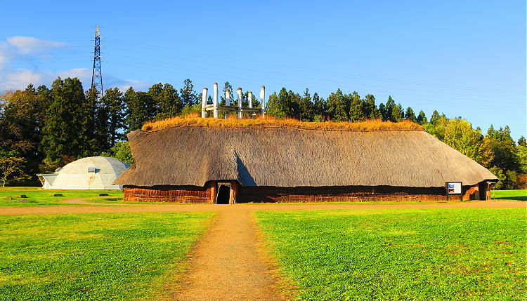 | 大型竪穴建物。この建物の長さ約32メートル、幅約10メートルの大きなものが復元されている。このような建物は、集落の中央付近から見つかることが多く、集会所、共同作業所、共同住宅などの説がある。 |