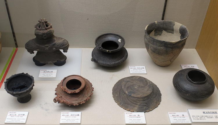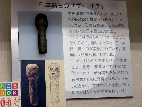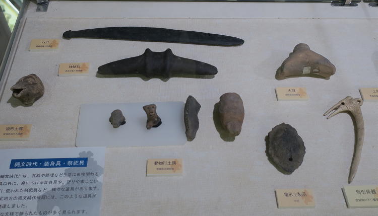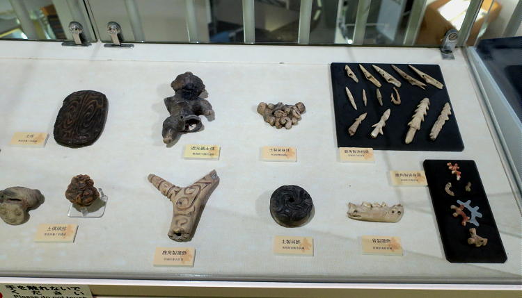 | 縄文遺物の展示。中央後列に「遮光器土偶」があるのがうれしい。 |