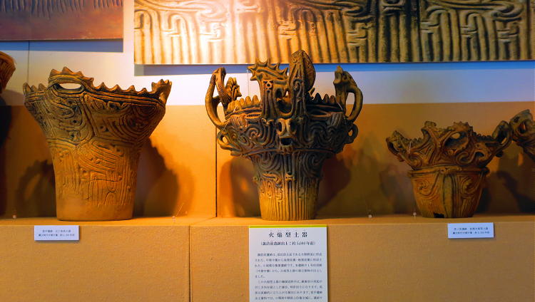 津南町出土の縄文土器・石器を館内で展示しており、直接触れる展示もある。