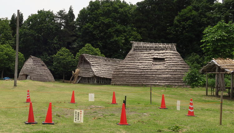| 野外には、沖ノ原遺跡をモデルとした7棟の竪穴住居が復元され、約5,000年前の風景が再現されている。 |