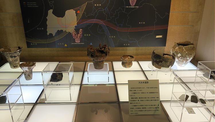 大光寺遺跡は、昭和42年(1967年)に発掘調査が行われ、この火焔土器を始め、東北地方や中部高地の土器などが出土した。