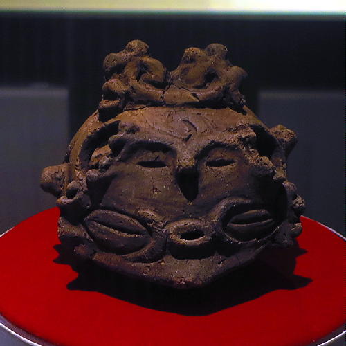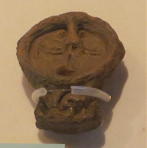 この人面付土版の表面には、女性の全身(顔・乳房・腕・足・性器・着衣)が表現され、非常に珍しい土版。