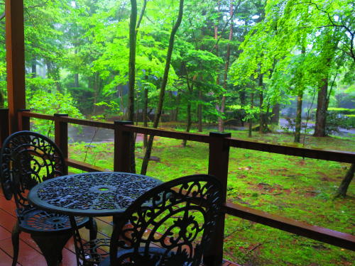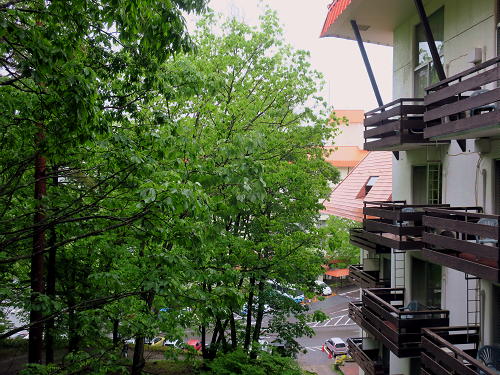 | 「草津温泉ホテルヴィレッジ」の窓を開け、湯上りの火照った体を冷ます。 |