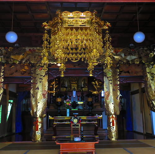 本堂内の光り輝く幢幡の装飾は、とても綺麗だ。 |