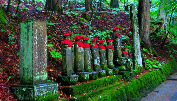 | 苔むした「六地蔵」が並んでいる。六地蔵というのは、六道のそれぞれにあって、衆生の苦悩を救済するという、六体の地蔵菩薩のこと。 |