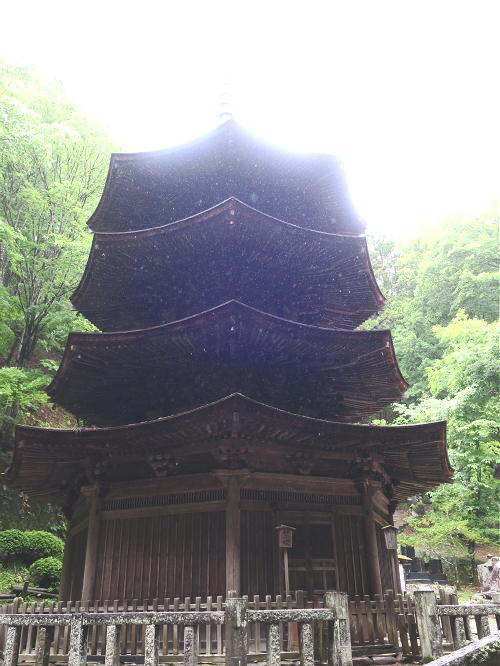 境内の奥に建つ日本で唯一の木造の「八角三重塔」は国宝に指定されている。
