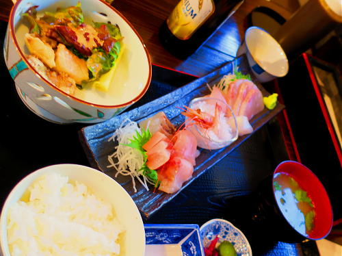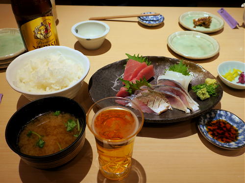 「ふうみん」は、「お刺身定食DX」と恵比寿ビール。