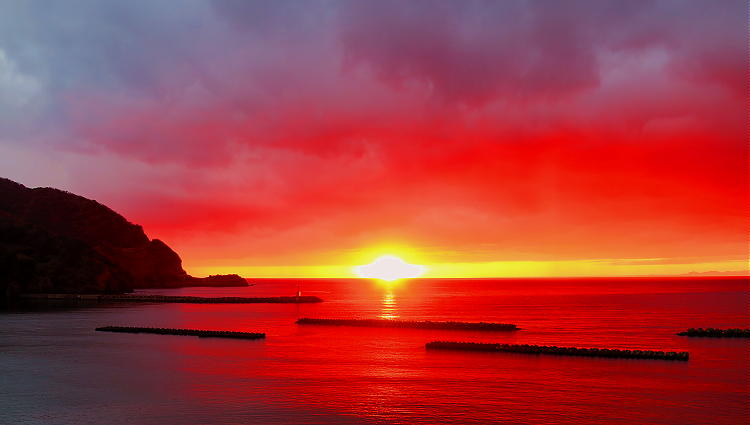 | 部屋から眺めた夕暮れ。一面が朱色に染まり、まるで別世界のようだ。 |
