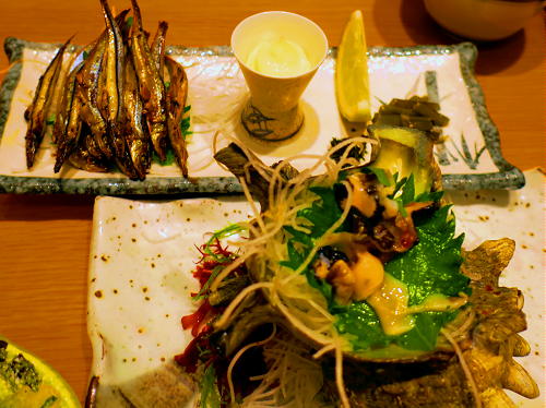 「松崎燻りきびなご」と「サザエの刺身」。 |