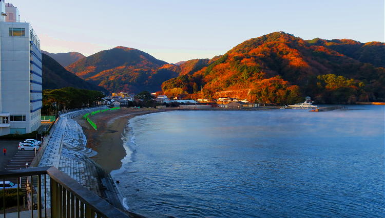 駿河湾を目の前に佇む伊豆まつざき荘の温泉は、最上階の6階にあり眺望が楽しめる。