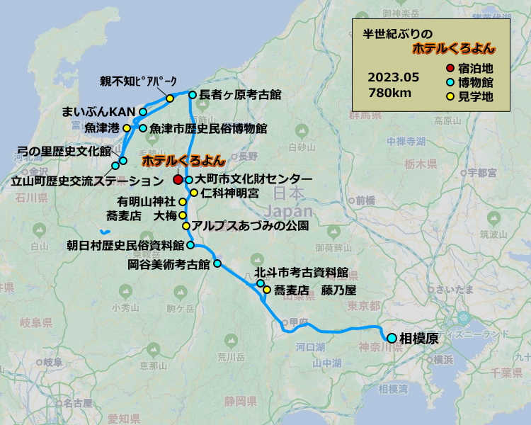 ホテルくろよん → 国営アルプスあづみの公園 → 岡谷美術考古館 → 北杜市考古資料館 → 藤乃家 → 相模原 |