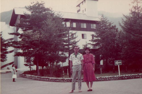 | 半世紀前の「ホテルくろよん」の前で、家人の「yayo」と |