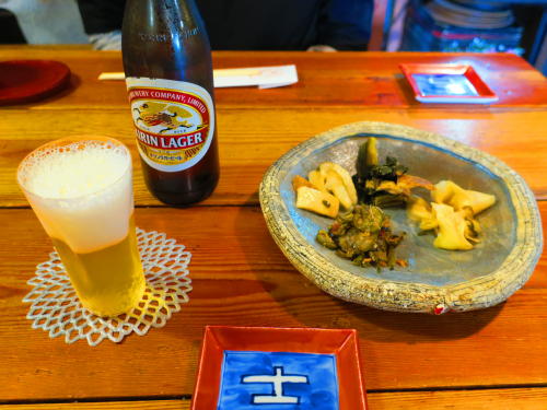 漬物をつまみに、ビールでのどを潤す。
