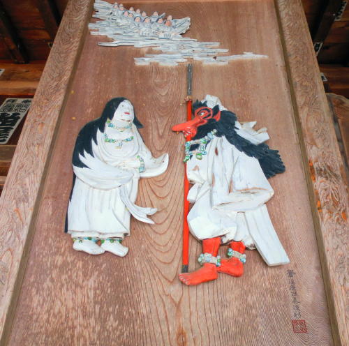 拝殿の天狗の扁額が印象的だ。 |