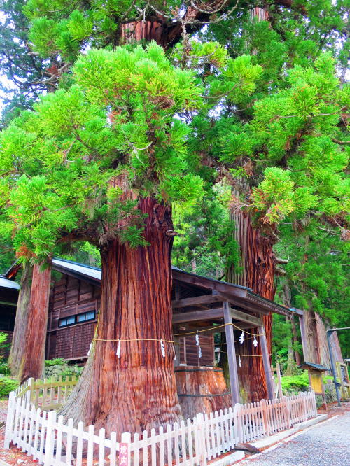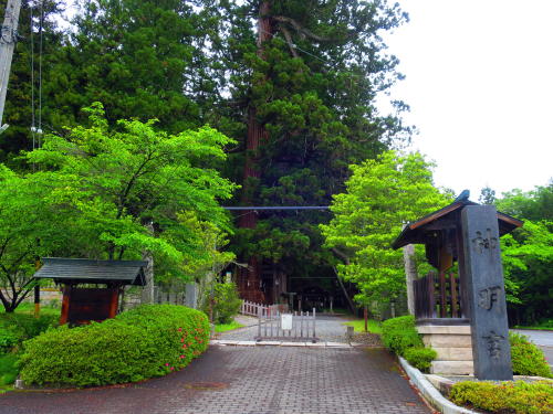 境内に入ってすぐ左の三本杉は、中1本を欠損しているが、目通り周囲5.70m・5.45m、樹高50mをこえて美しい姿をしている。 |
