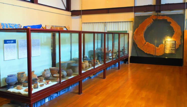 | ■14:46 縄文時代の遺跡のコーナー。奥には国宝の仁科神明宮の御神木のカットが飾られている。 |