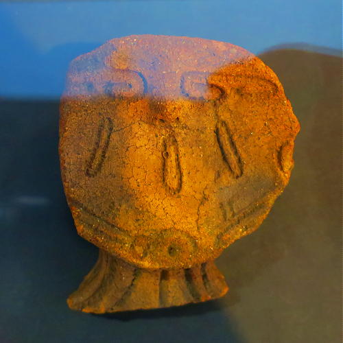 胴が丸く、首に4つの把手が付いた珍しい形の土器で、胴には大きな渦と剣の様な文様がある。