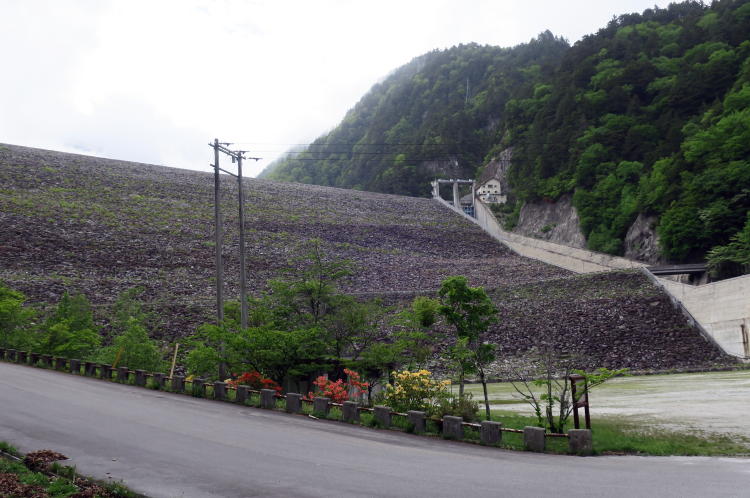東京電力の発電用のロックフィルダムで、上流にある高瀬ダムとこの下流の七倉ダムは揚水発電所用のペアのダムになる。堤高125メートル堤頂長340メートル。 |