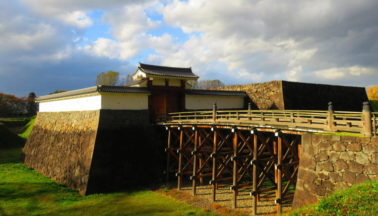 | ■14:11 山形県立博物館に向かうが、道を一本間違えて体育館の駐車場に車を停めて博物館まで歩く。復元なった山形城一文字門を通る。 |