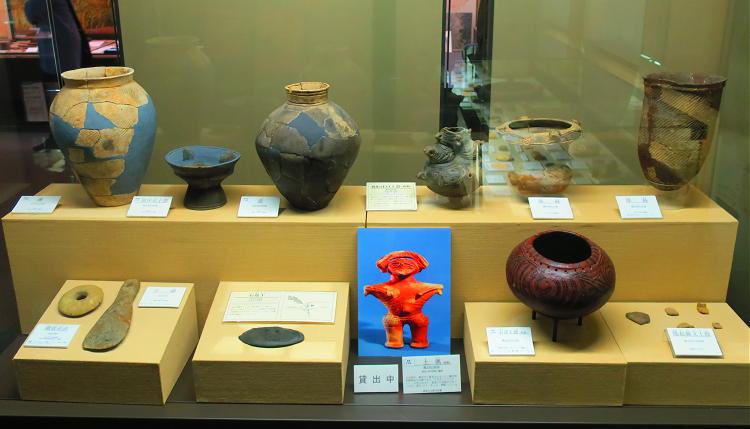 | ■ 13:38 深鉢2点と浅鉢1点。いづれも白須賀遺跡出土、縄文時代中期。 |