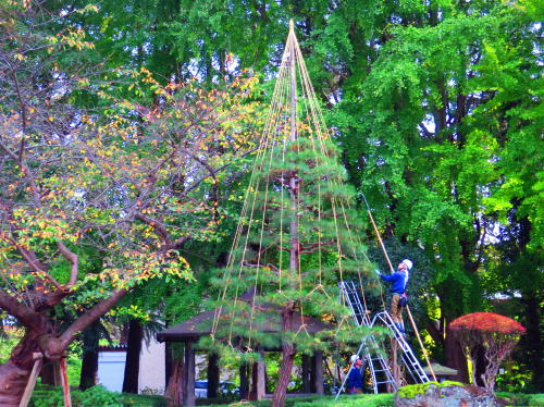 雪から木の枝を守るために施される「雪吊り」。