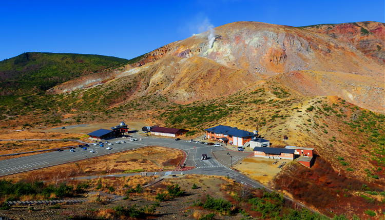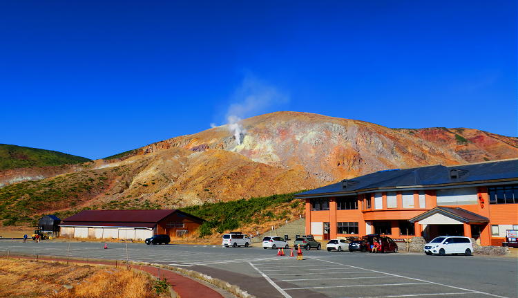 ホテルを出て、絶景の磐梯吾妻スカイラインを走り、標高1600メートルの「浄土平駐車場」に着いた。 |