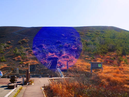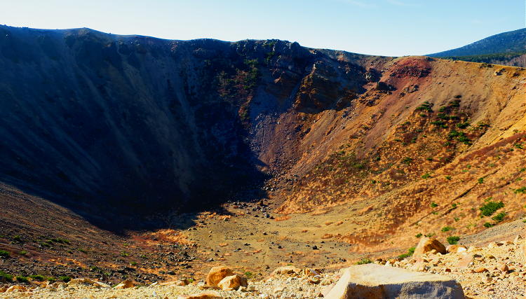 | ■9:32 吾妻小富士の火口は直径約500メートル、火口底まで70メートルもある。 |