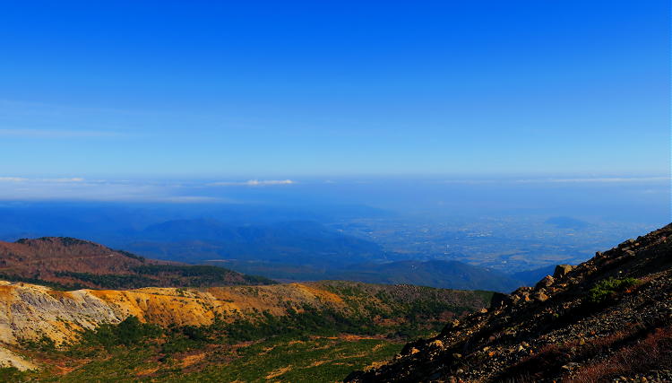 | ■9:31 頂上から、福島市方面を望む。残念な事に少し靄っている。火口壁を一周するのは、約一時間かかるので断念する。 |
