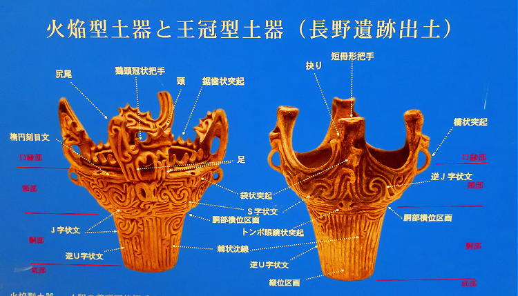 | ■9:04 長野遺跡出土。縄文時代中期の火焔型土器(左)と王冠型土器(中)。 |