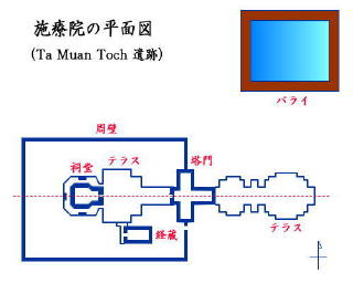施療院は主祠堂、経蔵、塔門、周壁、バライからなる小規模の伽藍である。