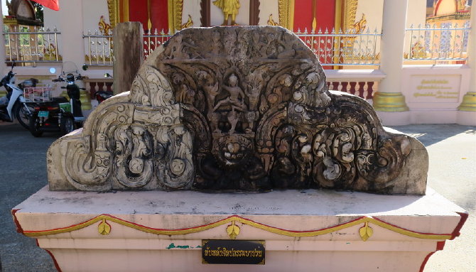 ●概要…寺院の境内に、クメール遺物の破風が置かれている。破風には「神像アイラーヴァタに乗るインドラ神」が彫られており、破風の左側部分はコンクリートで修理されている。