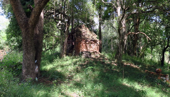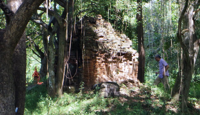 ●概要…地元の人のオートバイに先導されて、やっとクメール遺跡に到着した。林の中に半壊したレンガの祠堂が1基建っている。この遺跡についての詳細は分からず。
