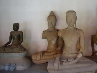 この、クメールの祠堂の正面は東だ。そこには仏陀立像と拝殿のラテライトの柱が残されており、周りはトタンで囲まれて放置されている。