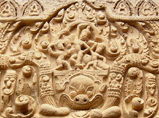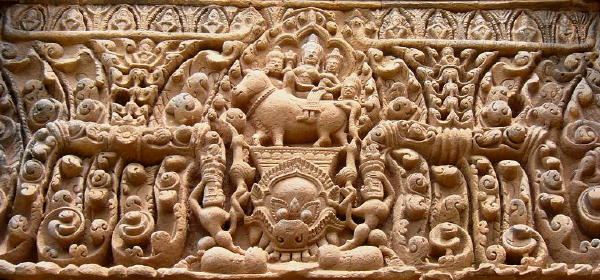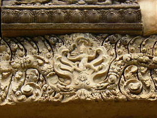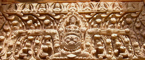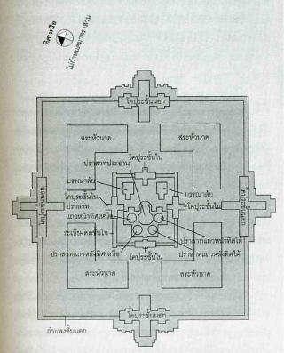 建物は左右対称で、東西南北に楼門を持ったラテライトの外壁と砂岩の回廊、レンガ造りの祠堂群があり、前列3基と後列2基の祠堂が建つていたが、今は前列中央は基礎を残すのみだ。