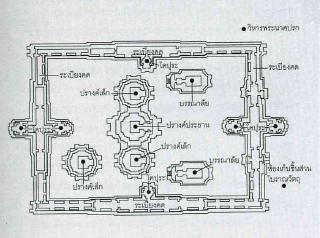 建物は4基の祠堂と2基の経蔵を回廊で囲んでおり、仏教寺院(ワット・サカンペーンヤイ)の境内にある。