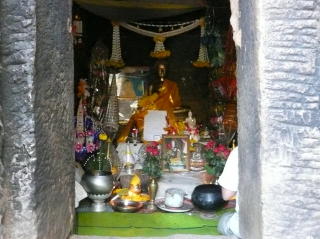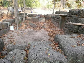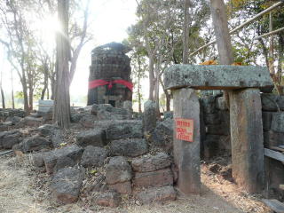 T.I.さんから、この遺跡の「経蔵」にそれらしい石が置いてあり、調べてほしいとの依頼を受けた。下記の写真中央の逆凹型の石だが、どうも後世に適当に積まれた石の様だ。確信は持てないが、ソーマスートラではないと思う。