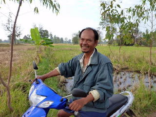 そこに、運良く二人乗りのオートバイが通りかかる。おじさんが運転、嫁さんが後ろに乗っている。遺跡の写真を見せると、嫁さんを降ろし「ふうみん」に乗れという。ご厚意に甘えて、オートバイの後席に乗り、やっと遺跡にたどり着いた。