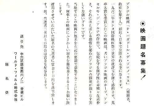 「映画題名募集!」は、ブラジル映画の題名の募集です。この映画の原題名は「約束を果す人」で、採用になった題名はは「約束のことば」でした。賞金は10万円で、私の友人が見事に射止めました。