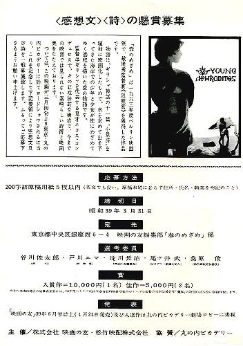 「春のめざめ」の感想文、詩の懸賞応募で、入賞作は1万円、佳作は5千円です。選考委員には、「谷川俊太郎」や「淀川長治」などのそうそうたるメンバーが揃っています。