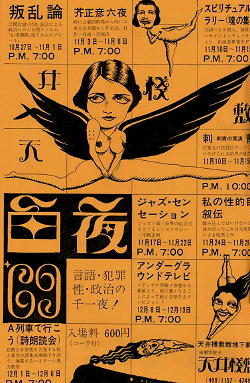 それから、天井桟敷を旗揚げして、そこからポピュラーになっていったんですが、そのころというのは、天井桟敷だけじゃなくて、蜷川君が同じ新宿でアングラの芝居を初めて演出したり、花園神社で唐十郎が赤テントを旗揚げしたり、串田和美が黒テントをやったり、鈴木忠志が後の早稲田小劇場を白石加代子とやったり、まだ無名の横尾忠則が舞台美術を担当し、コシノジュンコが売り出す前で衣装やってたり…、