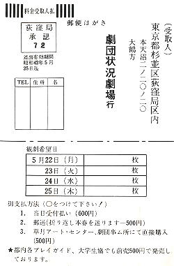 また、寺山は「天井桟敷の旗あげのときに、中古の花輪を贈ってもらったのを思い出し、はじめ酒にでもしようと思っていたのを、おもしろいと思って葬式用の花輪を贈った。かれとは脚本や作品を見てやったこともあるし、近くで公演するからといって敵対意識なんてとんでもない」といっている。 |
